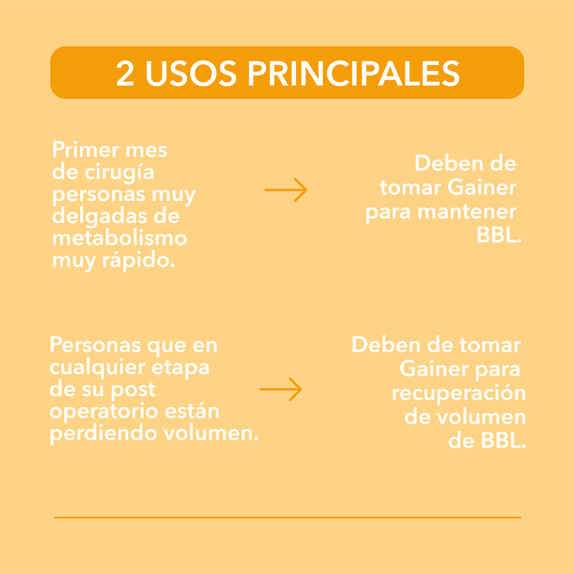 - Personas que en cualquier etapa de su post operatorio, perdieron gran porcentaje de lipotransferencia BBL, esta en especial, ayuda por su alto contenido en carbohidratos a recuperar volumen de lipotransferencia (para recuperación de volumen consumase 1 a 3 meses, aparte de todas sus comidas)