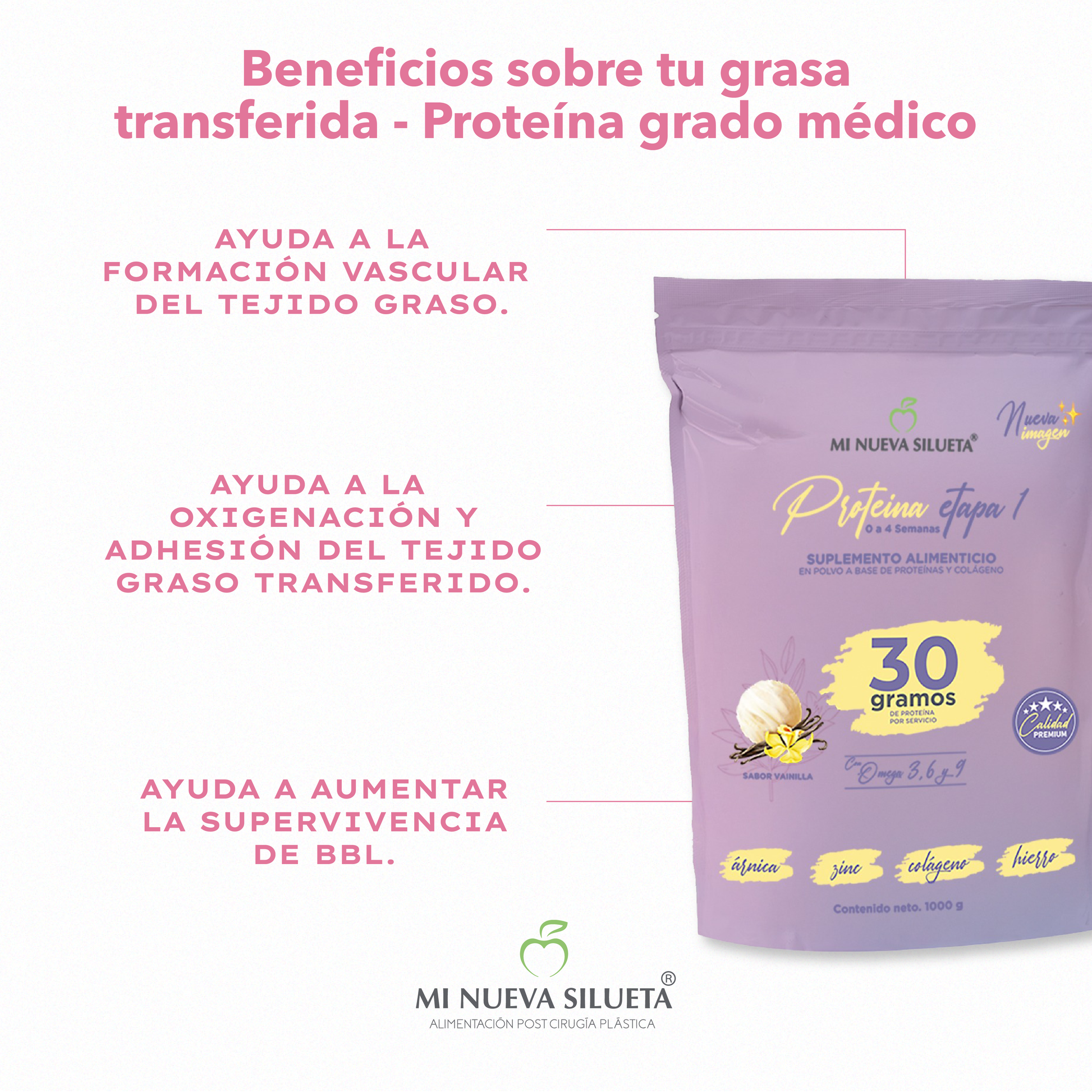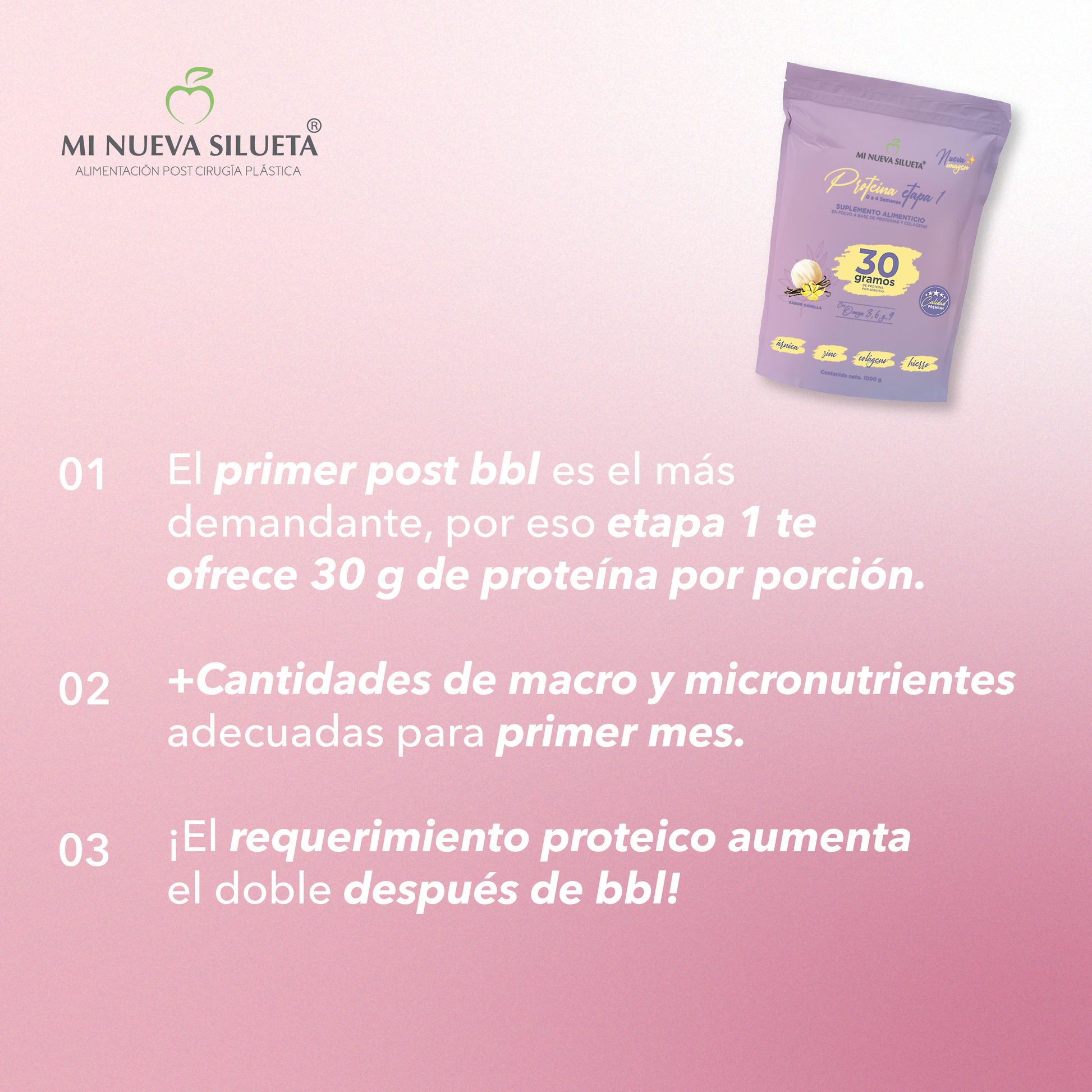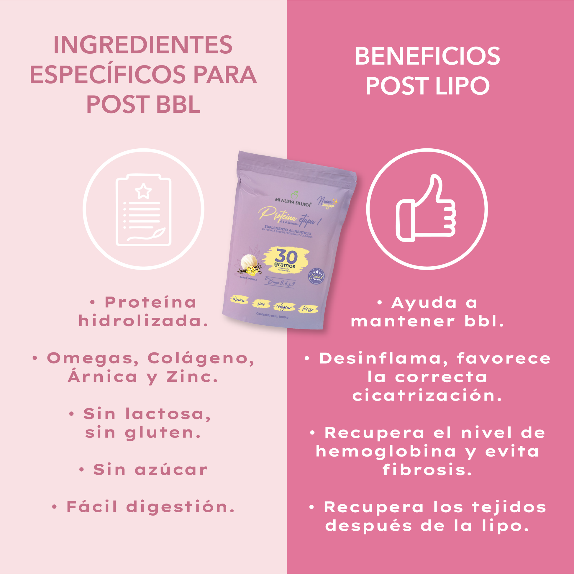 Cuando una persona es sometida a un proceso de liposucción, entra en un estado de hipermetabolismo, esto significa que el cuerpo requiere más calorías y proteínas, si usted no brinda los requerimientos aumentados, el cuerpo movilizara proteínas de la masa muscular para reparar los tejidos dañados en la liposucción. Alcanzar estos requerimientos solo con alimentación, demandaría el consumo de grandes cantidades de proteínas de alto valor biológico, que seria complicado para la persona recién operada. La proteína mi nueva silueta le ayudara a cubrir estos requerimientos siendo, fácil su consumo. Aparte por sus ingredientes adicionados, ayudara a su cuerpo a sanar más rápido.